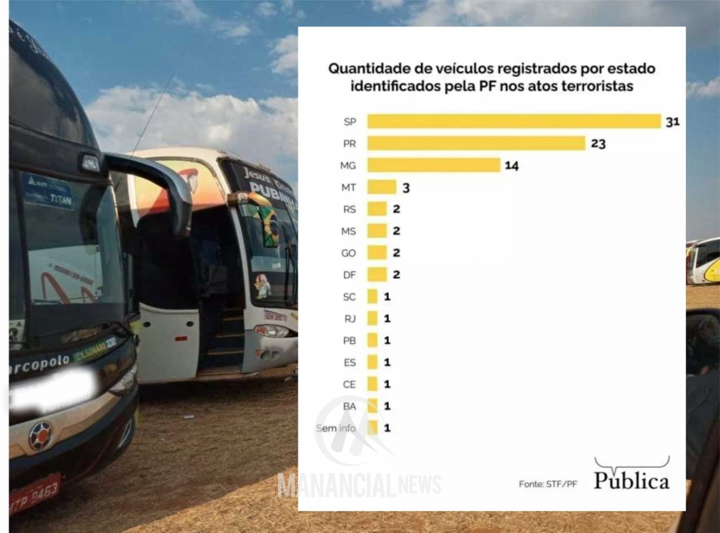 As informações são com base em um levantamento inédito da Agência Pública de jornalismo investigativo que apurou os dados através de registro de 86 veículos identificados pela Polícia Federal (PF), no dia das manifestações terroristas.