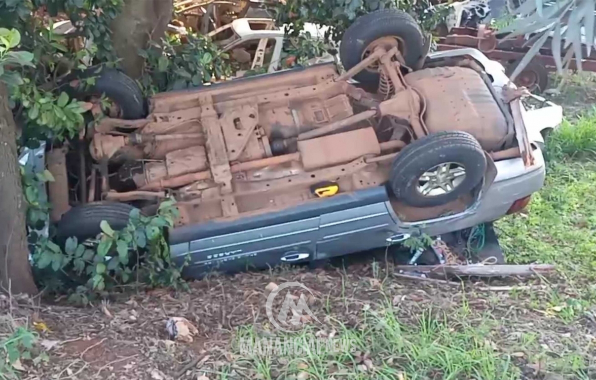 Um veículo Jeep Cherokee colidiu com uma camionete S-10 e acabou capotando por algumas vezes e caiu em um barranco de uma chácara onde pátio de um ferro velho.