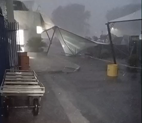 No cemitério municipal, o vento derrubou barracas que haviam sido montadas para receber os visitantes neste domingo (2), Dia de Finados. Imagens e relatos compartilhados nas redes sociais também mostram casas destelhadas em diferentes bairros.